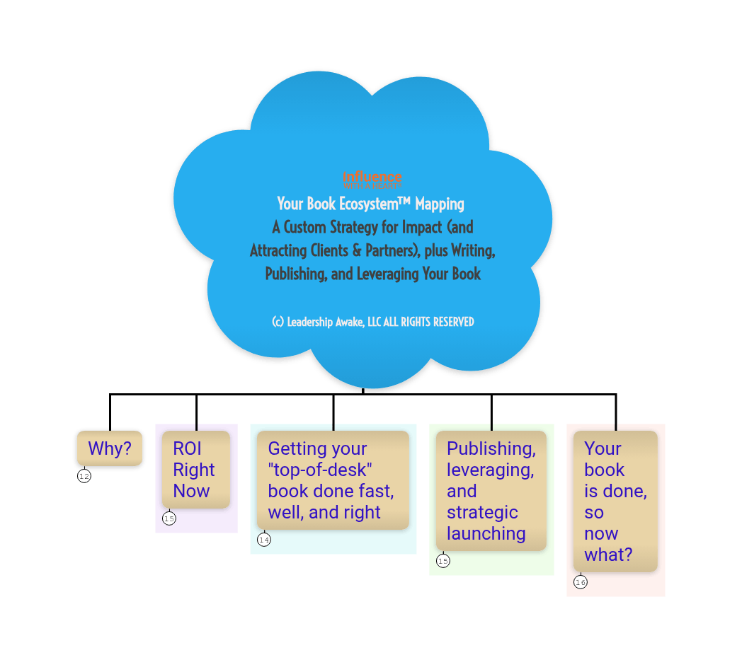 1. Your book: content, audience, intention of how you want to use the book, how you want it to impact people, how you want it to affect your business, your livelihood, your impact, your freedom, your lifestyle, and all the things that are important to you